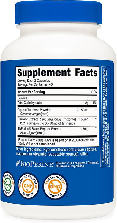 پودر زردچوبه ارگانیک، عصاره زردچوبه (۹۵٪ کورکومینوئیدها) ۲۵:۱، عصاره فلفل سیاه بیوپرین، کپسول هیپروملوز (سلولز)، استئارات منیزیم (منبع گیاهی).