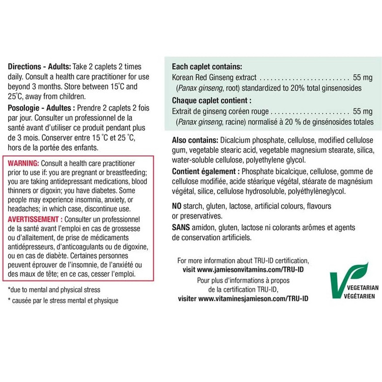 محصول جینسینگ قرمز کرهای جمیسون حاوی 55 میلیگرم عصاره ریشه جینسینگ است که به صورت استاندارد شده به میزان 20 درصد جینسینوساید تولید میشود. این محصول فاقد نشاسته، گلوتن، لاکتوز و رنگها و طعم دهنده های مصنوعی است. جمیسون با دارا بودن گواهینامه TRU-ID، اصالت و خلوص ترکیبات خود را تضمین میکند.