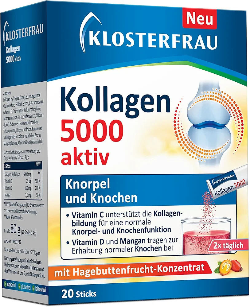 پودر Kollagen 5000 برند Klosterfrau یک مکمل پیشرفته برای حمایت از مفاصل، استخوان‌ها و غضروف‌ها است. این مکمل حاوی 5000 میلی‌گرم کلاژن با کیفیت بالا به همراه ویتامین C، D و منگنز بوده و به گونه‌ای طراحی شده که به حفظ سلامت ساختار اسکلتی و حرکت طبیعی مفاصل کمک کند. فرم استیکی این محصول مصرف آن را آسان و سریع کرده است.