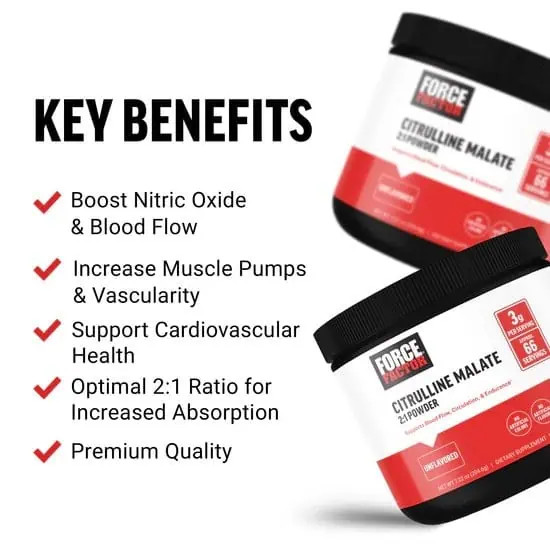 سیترولین مالات فورس فکتور با نسبت 2:1 مکملی ایده آل برای ورزشکاران و افراد فعال است. هر پیمانه نسبت بهینه ال سیترولین به مالات را فراهم می کند و جذب و اثربخشی را به حداکثر می رساند. مکمل فورس فکتور برای جریان و گردش خون ساخته شده است.