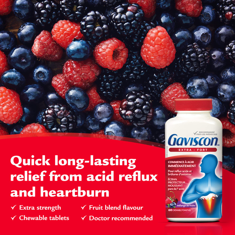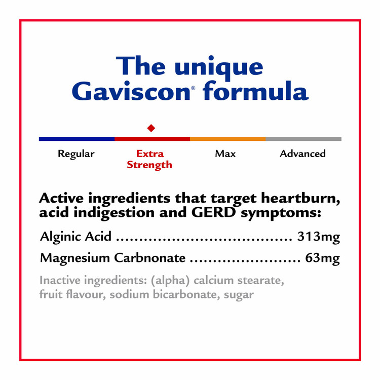 تسکین سریع و طولانی مدت سوزش سر دل: قرص‌های Gaviscon Extra Strength که توسط پزشک توصیه شده است، فوراً کار می‌کنند و در عرض چند دقیقه تسکین طولانی‌مدت سوزش سر دل را ارائه می‌کنند که ساعت‌ها طول می‌کشد. احساس کنید فوم فوم گاویسکون شروع به کار می کند