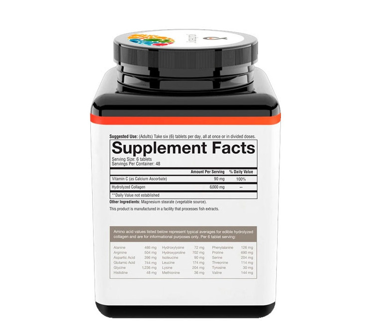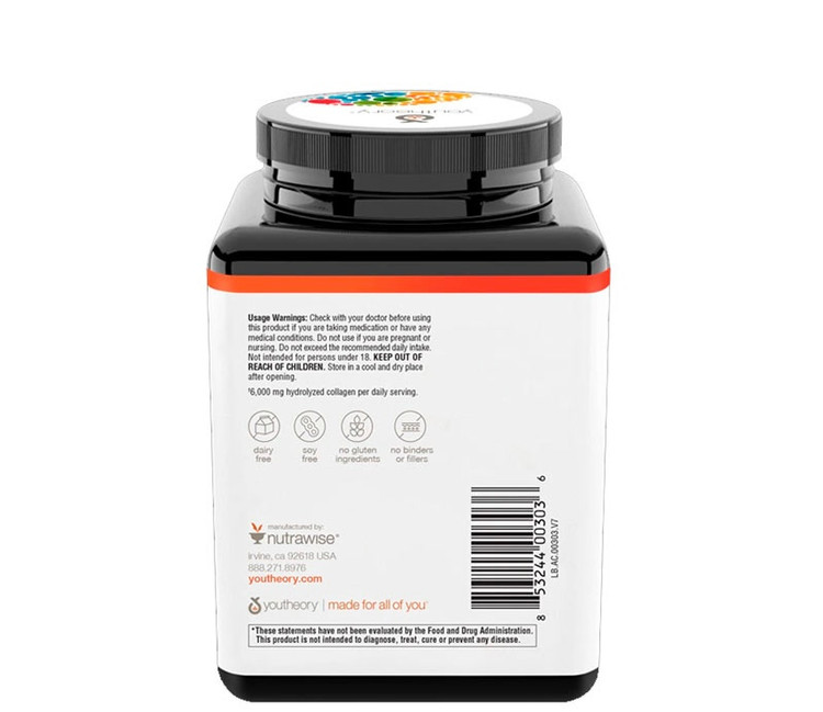 مکمل کلاژن برند Youtheory در هر وعده غذایی مقدار6000 میلی گرم کلاژن هیدرولیز شده و 90 میلی گرم ویتامین Cرا وارد بدن می کند. فرمولاسیون پیشرفته و هیدرولیز شده ی کلاژن که حاوی 18 اسید آمینه است، به راحتی هضم شده و به سرعت در بدن جذب می شود و کلاژن بدن را مجددا بازسازی می کند. پپتید های کلاژن به همراه ویتامین Cبه احیا و تقویت پوست، مو، ناخن، تاندون ها و رباط ها و … کمک کرده و با اثرات پیری مبارزه می کند. قرص کلاژن یوتئوری فاقد لبنیات، سویا و گلوتن می باشد.