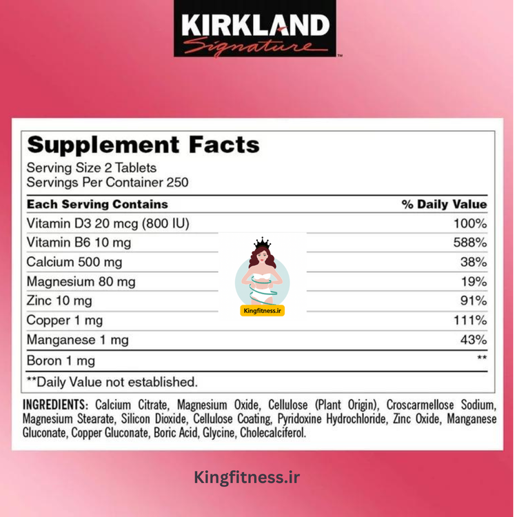 حقایق مکمل: اندازه وعده: :: 2 قرص حاوی دو قرص -٪ ارزش روز: ویتامین D3 800 I.U. – 200٪ ، ویتامین B6 10 میلی گرم – 500٪ ، کلسیم 500 میلی گرم – 50٪ ، منیزیم 80 میلی گرم – 20٪ ، روی 10 میلی گرم – 66٪ ، مس 1 میلی گرم – 50٪ ، منگنز 1 میلی گرم – 50٪ ، بور 1 میلی گرم – مواد لازم: سیترات کلسیم ، ژل سلولز ، اکسید منیزیم ، تالک ، هیدروکسی پروپیل متیل سلولز ، سدیم کروسکارملوز ، دی اکسید تیتانیوم (رنگ مصنوعی) ، هیدروکلرید پیریدوکسین ، استئارات منیزیم ، اکسید روی ، ویتامین D3 (روغن کلسیم ، سدیم کلسیم ، کلسیم گلوکونات کاپریک ، سیترات تری اتیل ، پلی اتیلن گلیکول ، نشاسته ذرت ، پلی سوربات 80 ، روغن سویا ، موم کارناوبا. حاوی: سویا